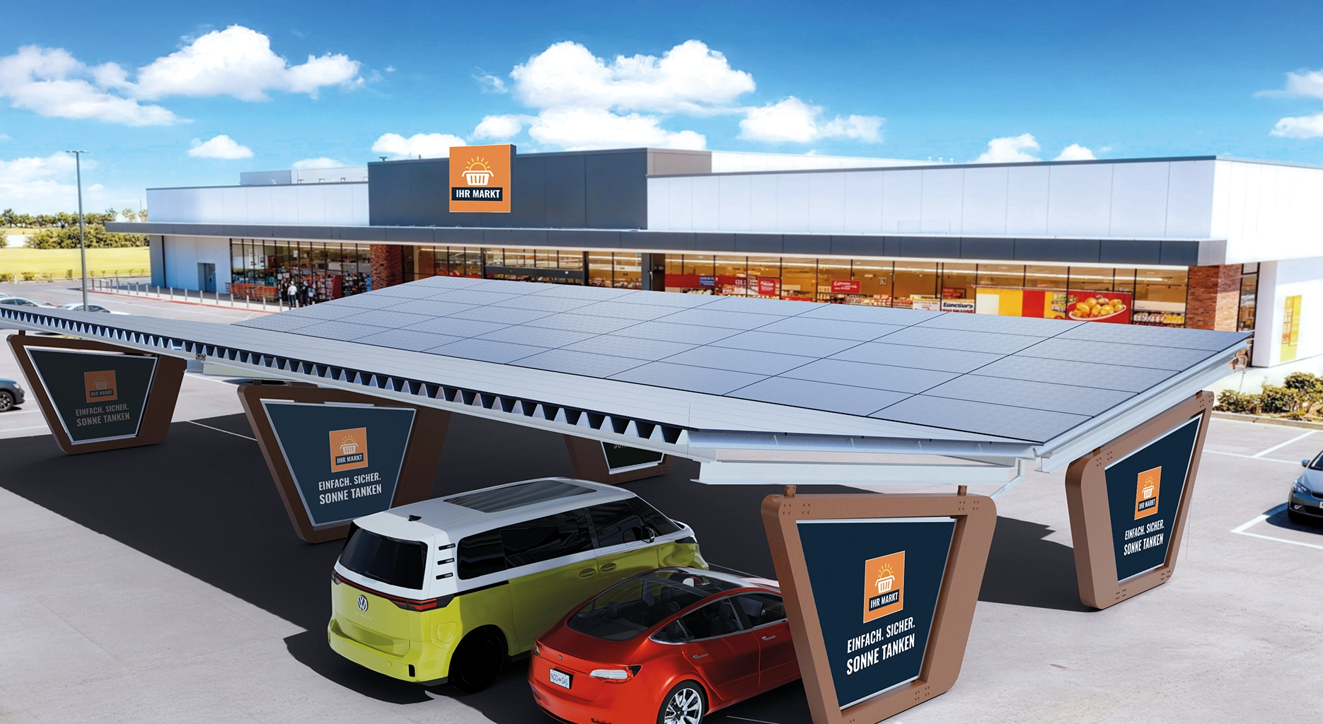 A solar carport with charging infrastructure makes the market more attractive than competing locations without charging facilities. E-mobility drivers prefer locations where they can charge their vehicles while shopping.